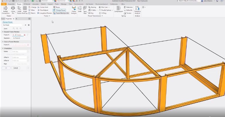No Inventor 2021, vários aprimoramentos foram feitos no gerador de quadros. Agora há uma melhoria na caixa de diálogo de nomenclatura de arquivo, permitindo um controle mais detalhado de seus esquemas de nomenclatura para componentes do gerador de quadros. Uma nova opção permite definir o nome do arquivo do componente para ser igual ao nome de exibição no navegador. Quando você cria quadros, um novo filtro de categoria permite agilizar sua seleção e as predefinições ajudam a salvar as configurações de quadro usadas com mais frequência para usar novamente mais tarde. A geometria agora pode ser filtrada no painel de propriedades e um novo glifo de visualização ajuda a orientar o quadro conforme você seleciona a geometria do esqueleto. Novas ferramentas de zoom ajudam a ajustar a vista perpendicular ao manipulador de quadros ou a uma vista isométrica de perto do manipulador de quadros. Ao terminar, você pode voltar à sua visualização inicial. Você também pode usar o comando Aparar / Estender para terminar membros em uma face curva.