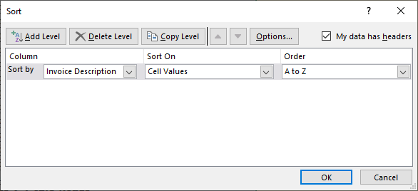 Para os fins desta introdução, presumiremos que você deseja classificar pelo conteúdo da célula (Valores das células no menu suspenso Classificar em) e, na caixa final, você pode selecionar a ordem em que deseja classificar. mudam, dependendo do tipo de dados na coluna que está sendo classificada, por exemplo, de A a Z para texto, do menor para o maior para números, do mais antigo para o mais recente para datas e todos os seus opostos.