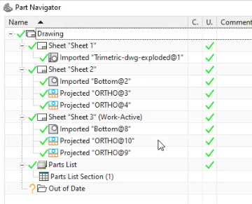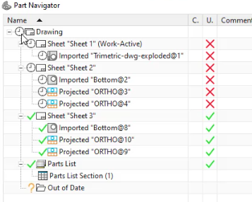 Um desenho fora de data exibirá um ícone de “fora de data” representado por um relógio no Navegador de Peças, e a coluna “Atualizado” mostrará um ‘x’ vermelho para alertá-lo.